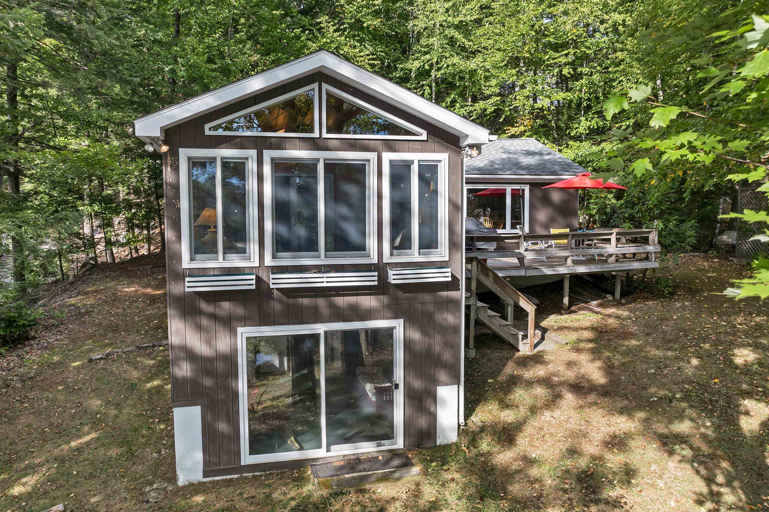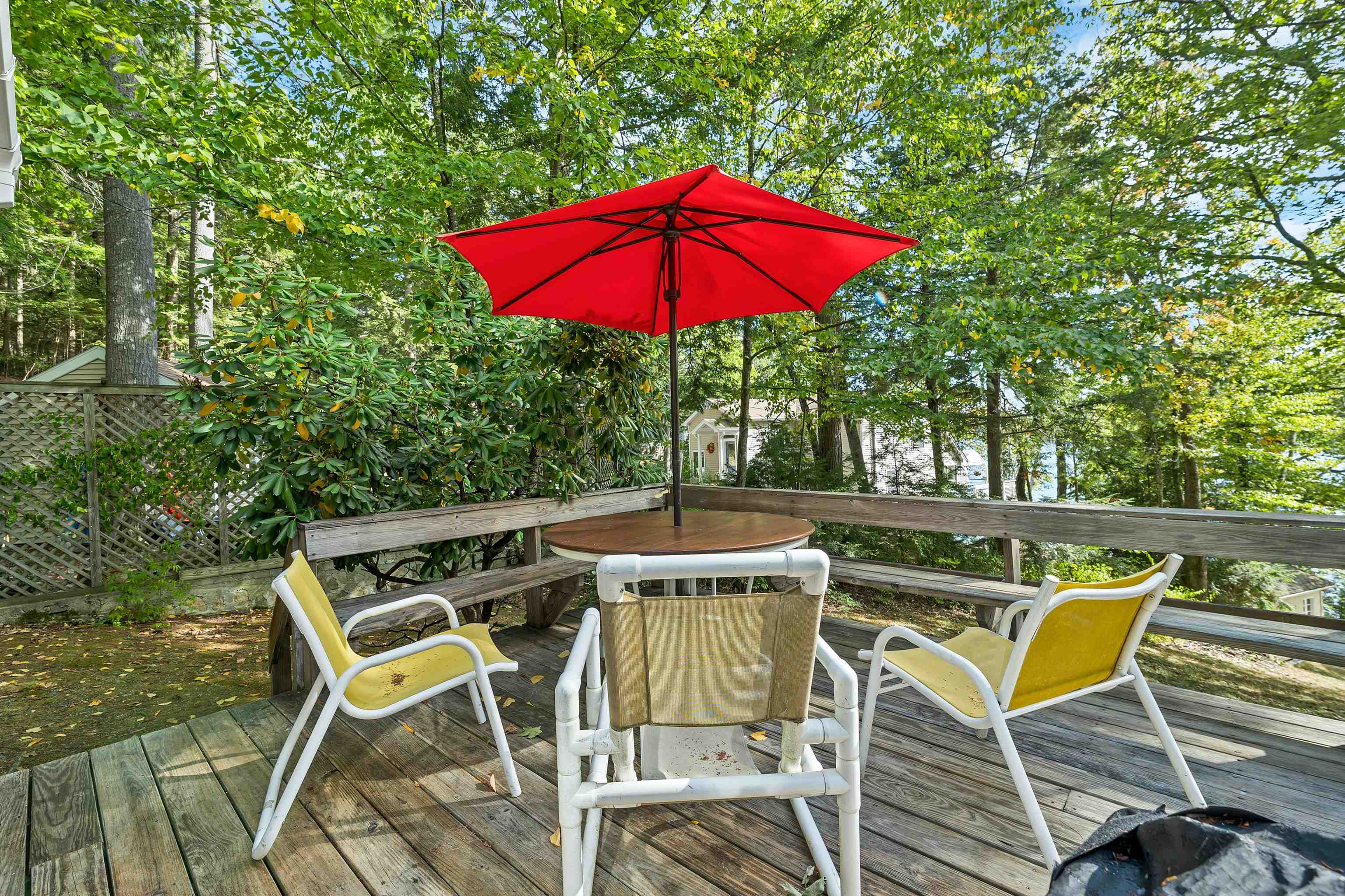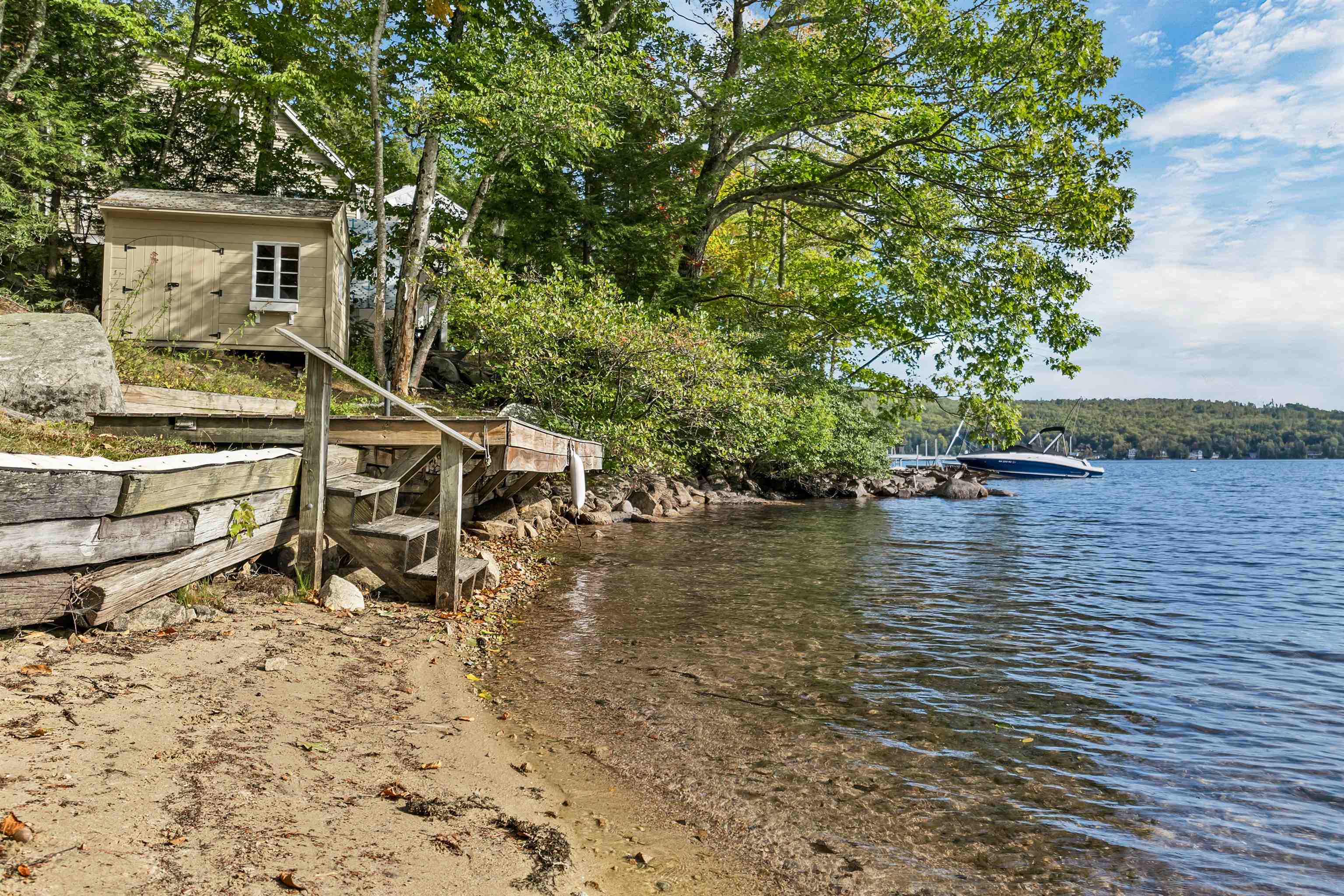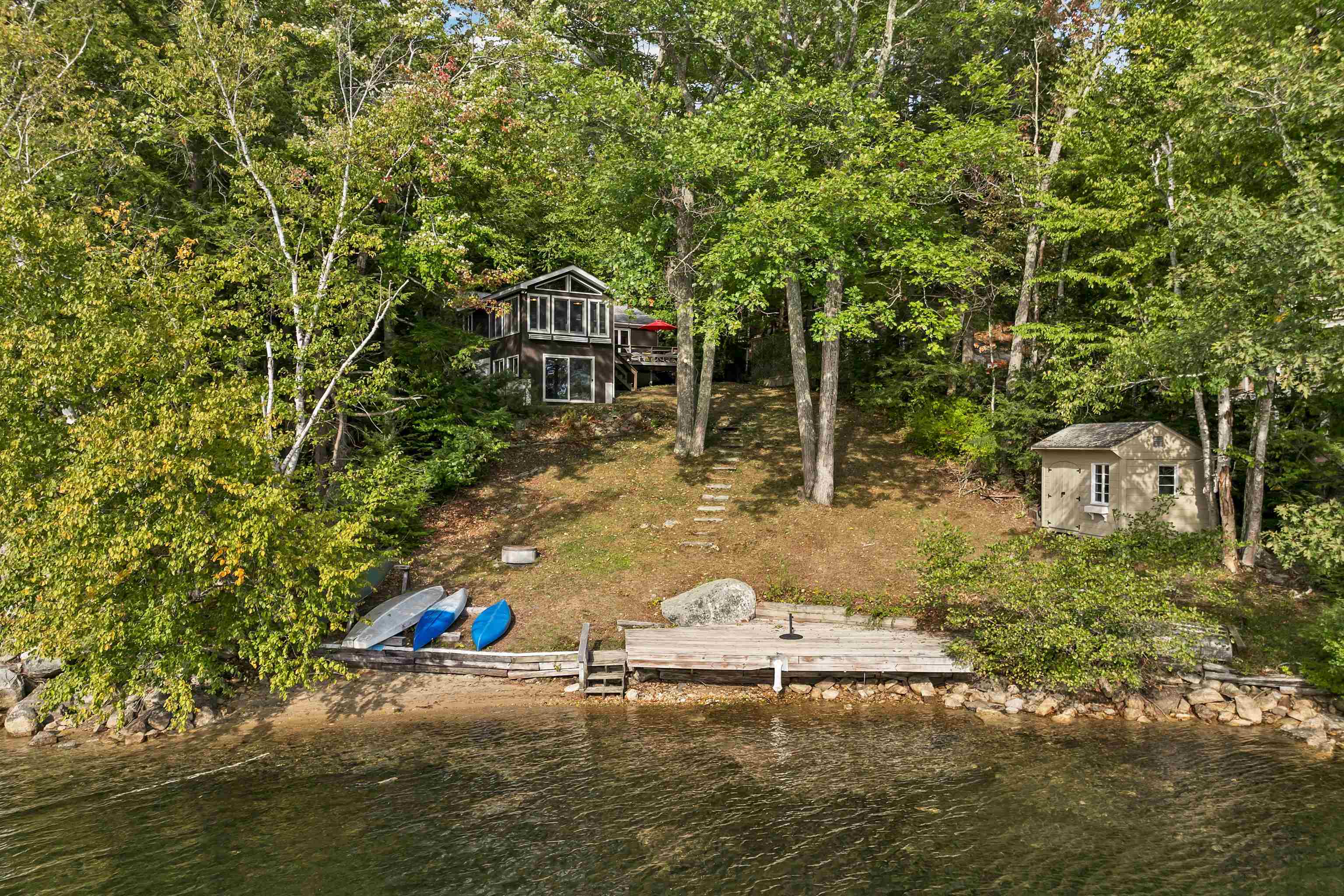 Contemporary Merrymeeting Lake Ranch on a sloping lot with 102' of southwest exposure on Pleasant Cove. This 2-bedroom Ranch has many memories for the Sellers. There is a hardwood oak floor in the open concept kitchen, dining area, and living room. A brick wood-burning fireplace adds warmth in the living room. The 2-level sunroom addition is accessed from the living room, and features a bonus room in the basement level. When you turn into the driveway there is an expanded parking area; the Sellers made occasional visits in the wintertime, by parking off North Shore Road and walking down to their Cottage. There is currently a large deck attached in front with access from either the dining area or the sunroom. Enjoy afternoon sun and lake views from the deck. You will find a wooden deck at the shorefront which is ideal for launching your kayaks and paddleboards. The gradual sandy shoreline on the sunny side of the cove is ideal for swimming. A seasonal dock could be situated close to the left corner of the shoreline where the water is deeper. Store your boating supplies in the lakeside shed. There are many newer homes in the Pleasant Cove neighborhood. This location and home may fill the needs of your family. Sign on property!