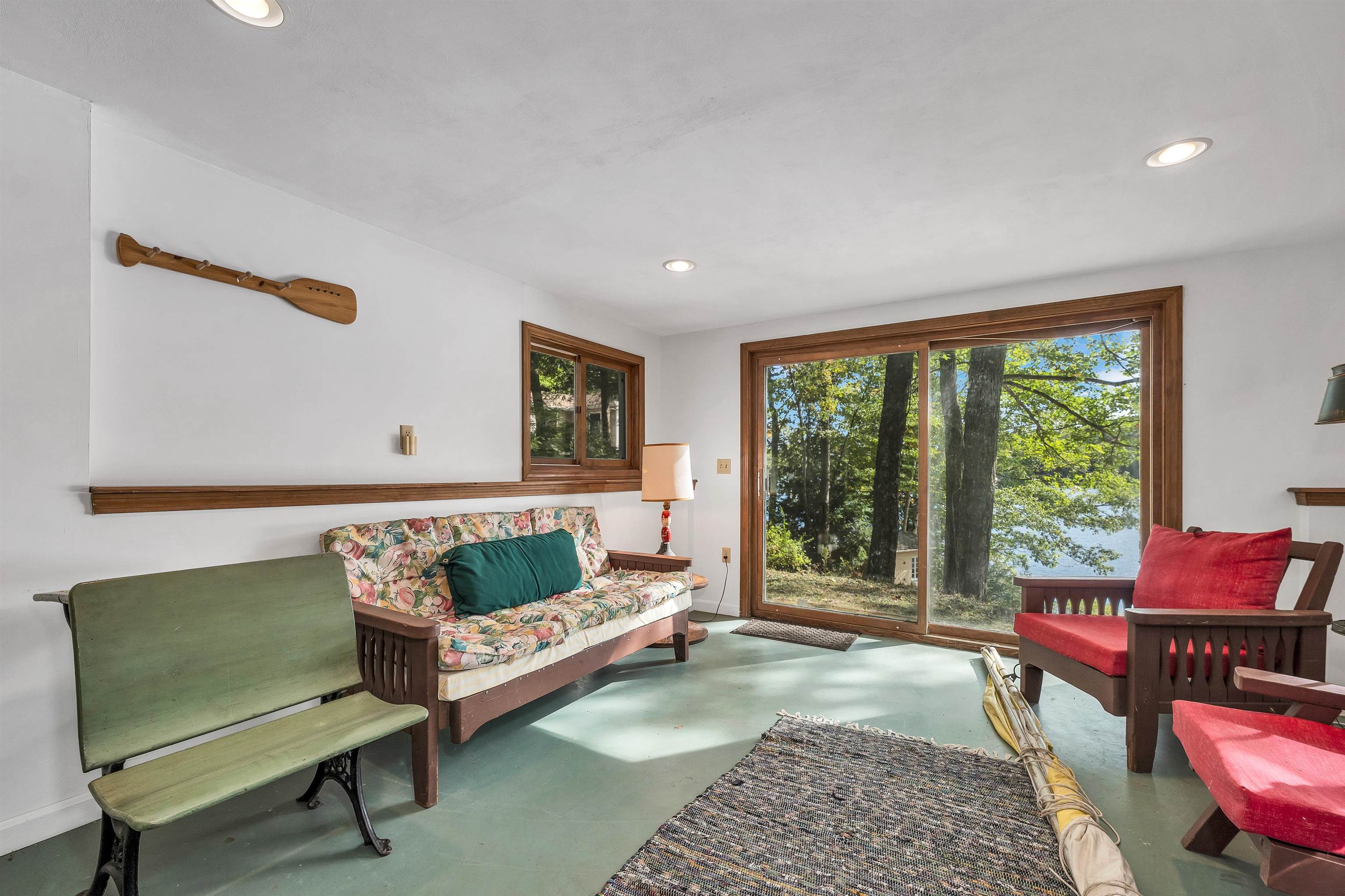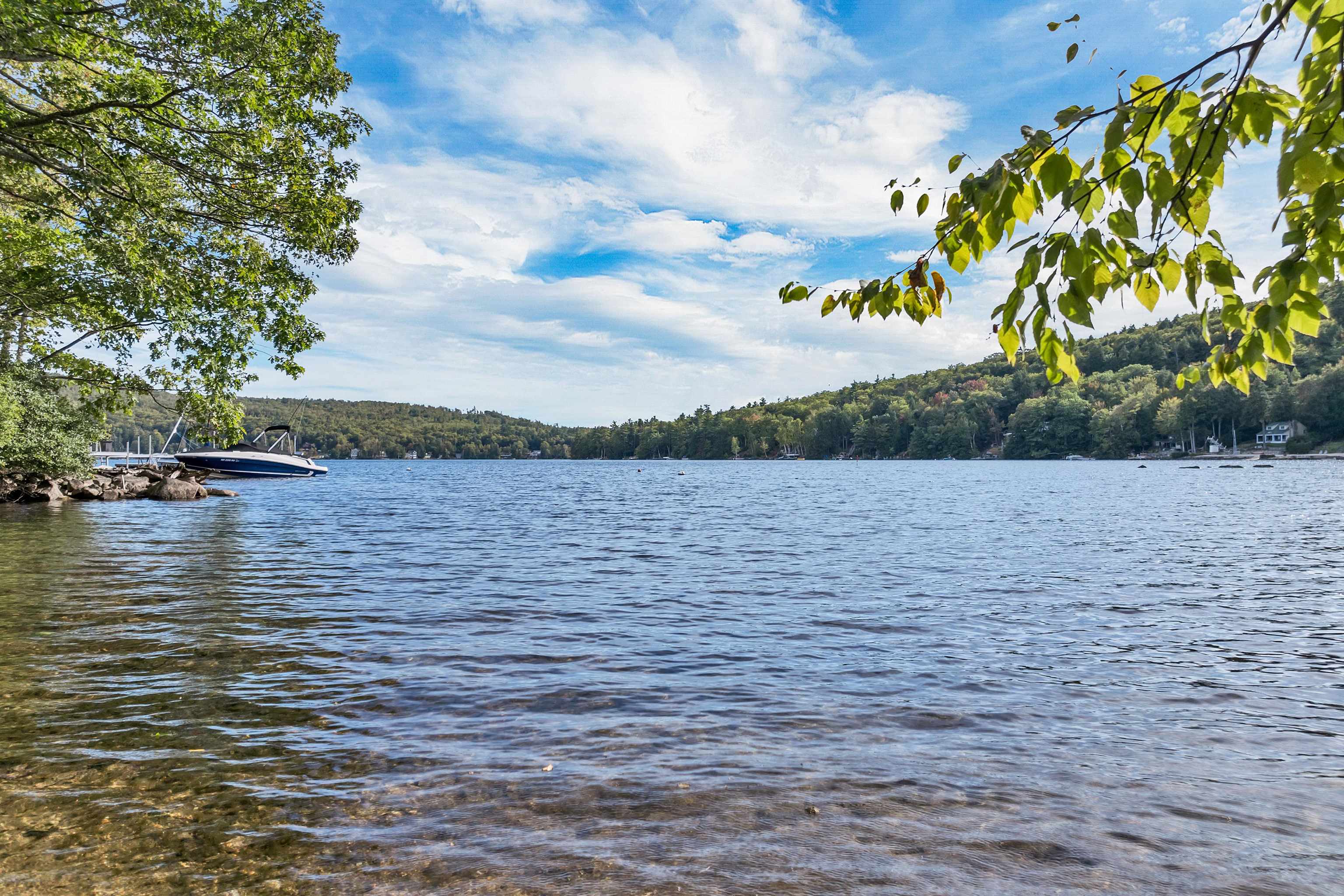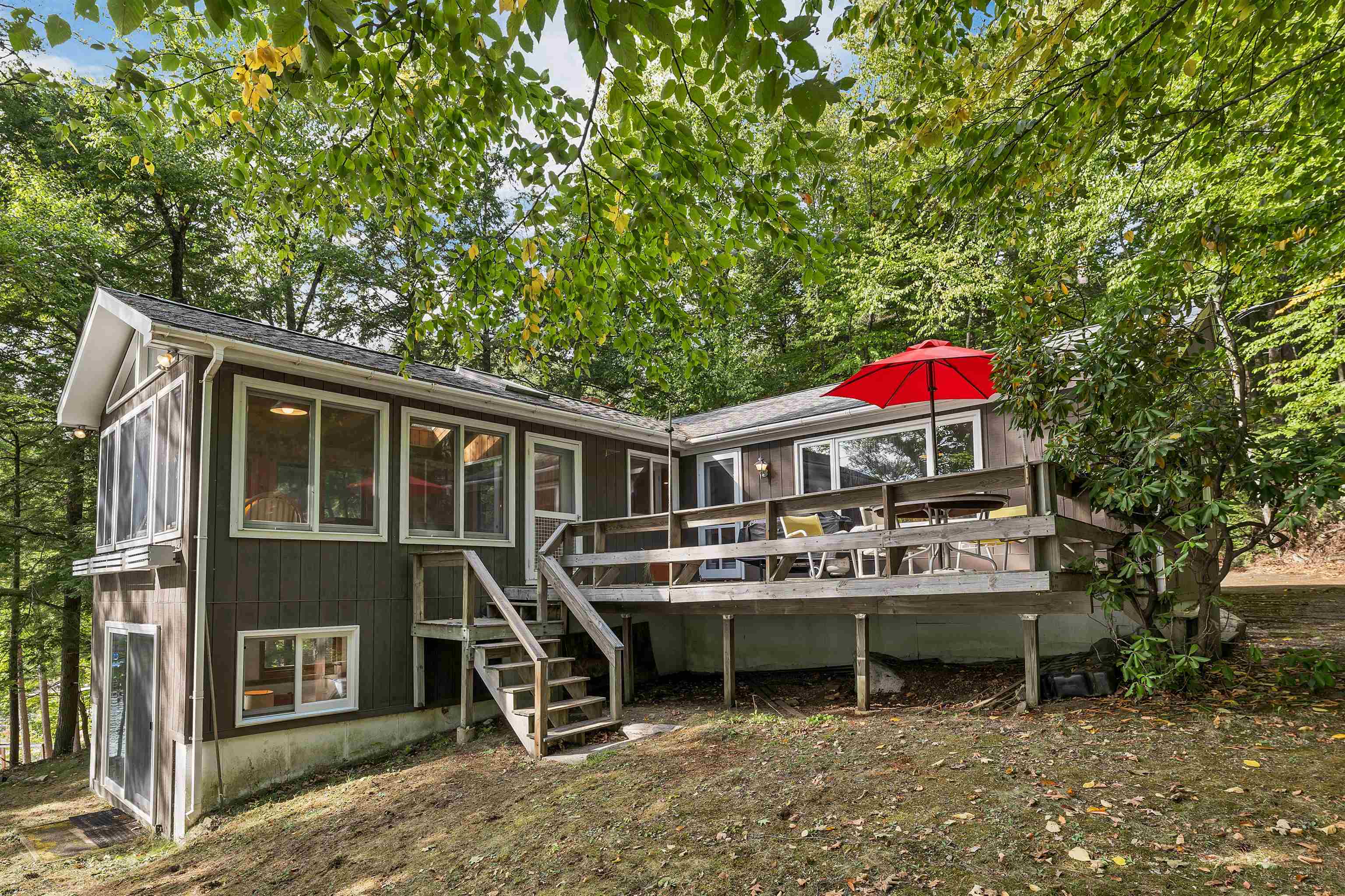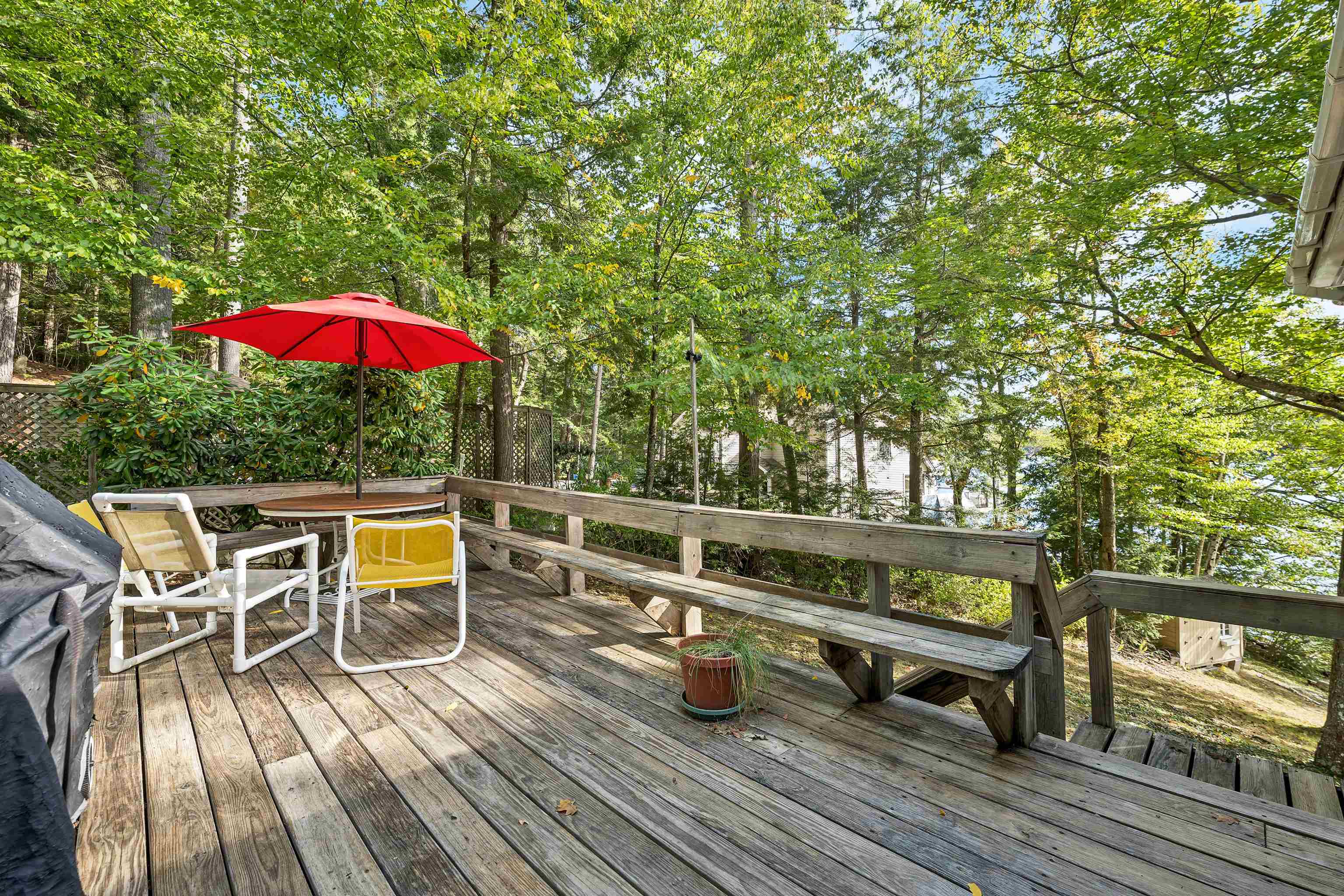 Contemporary Merrymeeting Lake Ranch on a sloping lot with 102' of southwest exposure on Pleasant Cove. This 2-bedroom Ranch has many memories for the Sellers. There is a hardwood oak floor in the open concept kitchen, dining area, and living room. A brick wood-burning fireplace adds warmth in the living room. The 2-level sunroom addition is accessed from the living room, and features a bonus room in the basement level. When you turn into the driveway there is an expanded parking area; the Sellers made occasional visits in the wintertime, by parking off North Shore Road and walking down to their Cottage. There is currently a large deck attached in front with access from either the dining area or the sunroom. Enjoy afternoon sun and lake views from the deck. You will find a wooden deck at the shorefront which is ideal for launching your kayaks and paddleboards. The gradual sandy shoreline on the sunny side of the cove is ideal for swimming. A seasonal dock could be situated close to the left corner of the shoreline where the water is deeper. Store your boating supplies in the lakeside shed. There are many newer homes in the Pleasant Cove neighborhood. This location and home may fill the needs of your family. Sign on property!