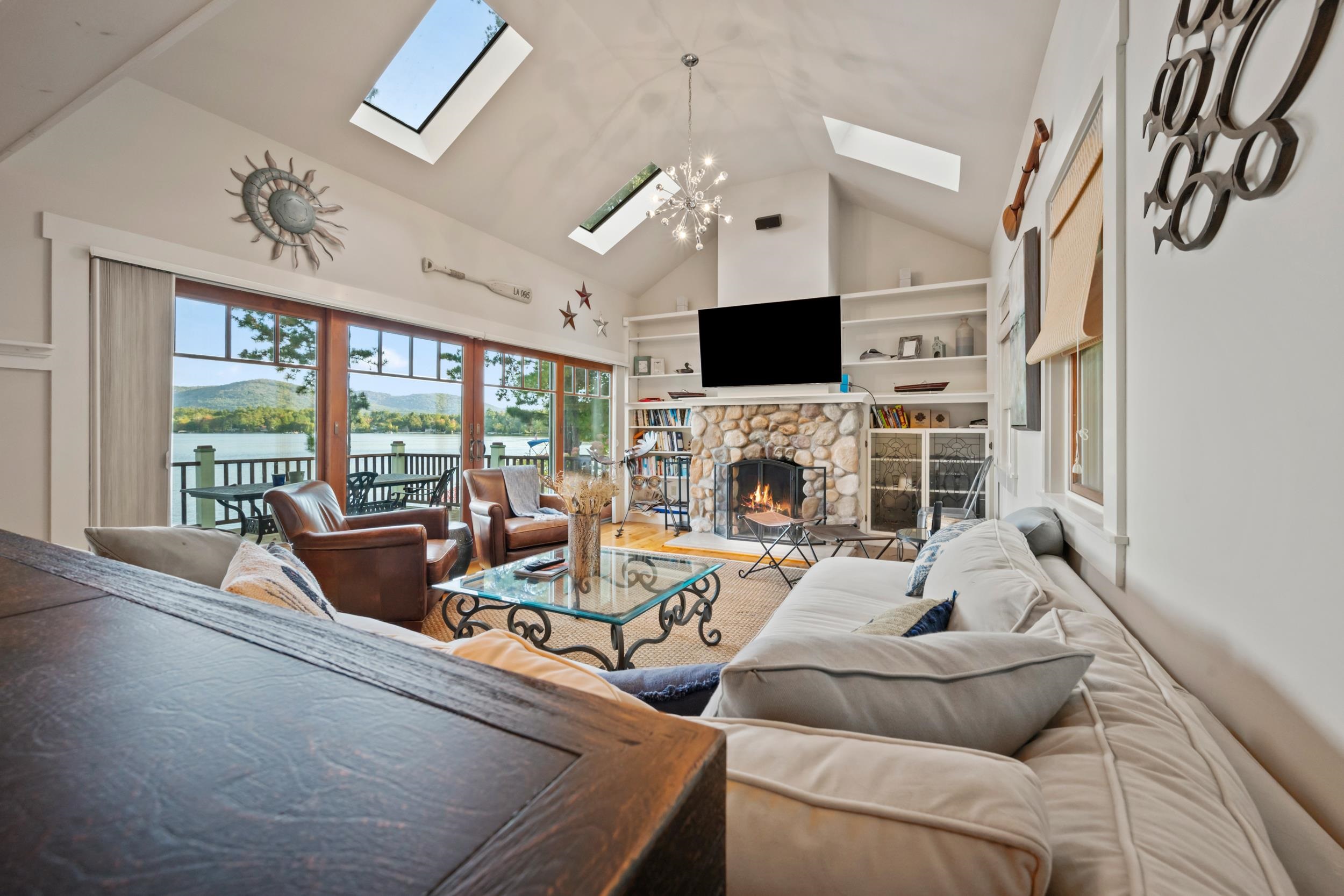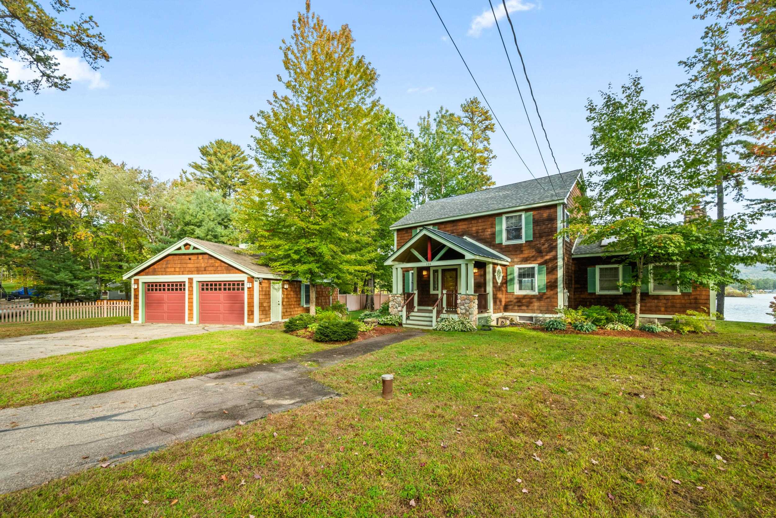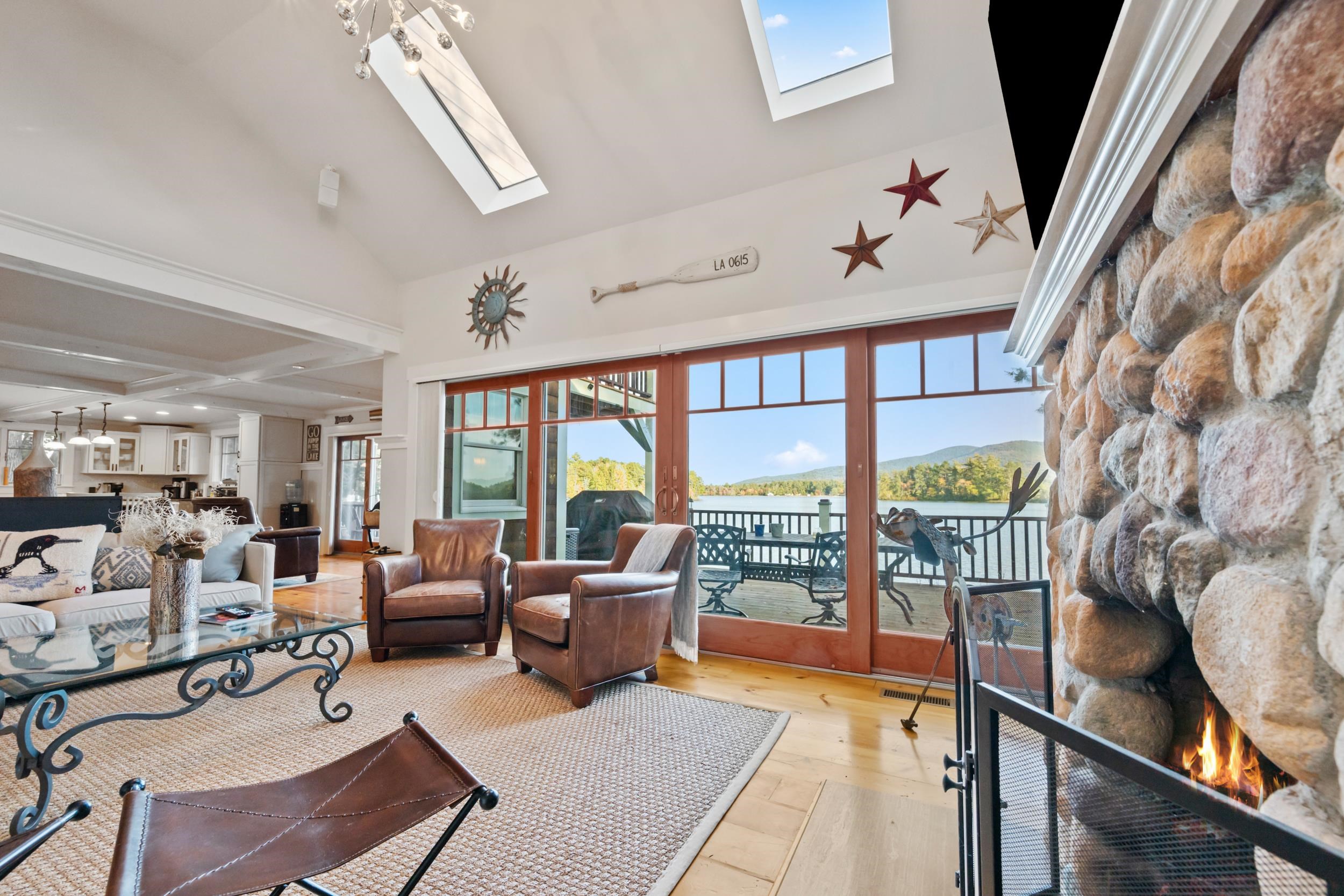 Stunning Ossipee Lake waterfront home on Leavitt Bay! This one of a kind 3 bedroom, 2 1/2 bath home blends timeless Craftsman details with modern comfort. As you step inside, beautiful views of the Lake, Green Mountain, and Loon Island create a striking backdrop to the heart of the home. The chef's kitchen, perfect for entertaining, includes Viking appliances, a wine refrigerator, marble countertops and a generous center island. Wide pine floors throughout the home add warmth and character. The inviting living room offers a cozy stone fireplace and walkout access to a spacious deck just steps to the waterfront. Upstairs you will find two bedrooms and a full bathroom, along with the primary suite featuring a gas fireplace, spa-like bath with a claw foot soaking tub and separate shower, plus a private balcony - the perfect place to enjoy your morning coffee while taking in the sunrise. Outdoors, a beautifully landscaped yard with outdoor shower/changing area, fire pit, irrigation system, and a detached 2 car garage. With 100 feet of sandy beach and your own private dock, this property captures the absolute best of lakefront living.