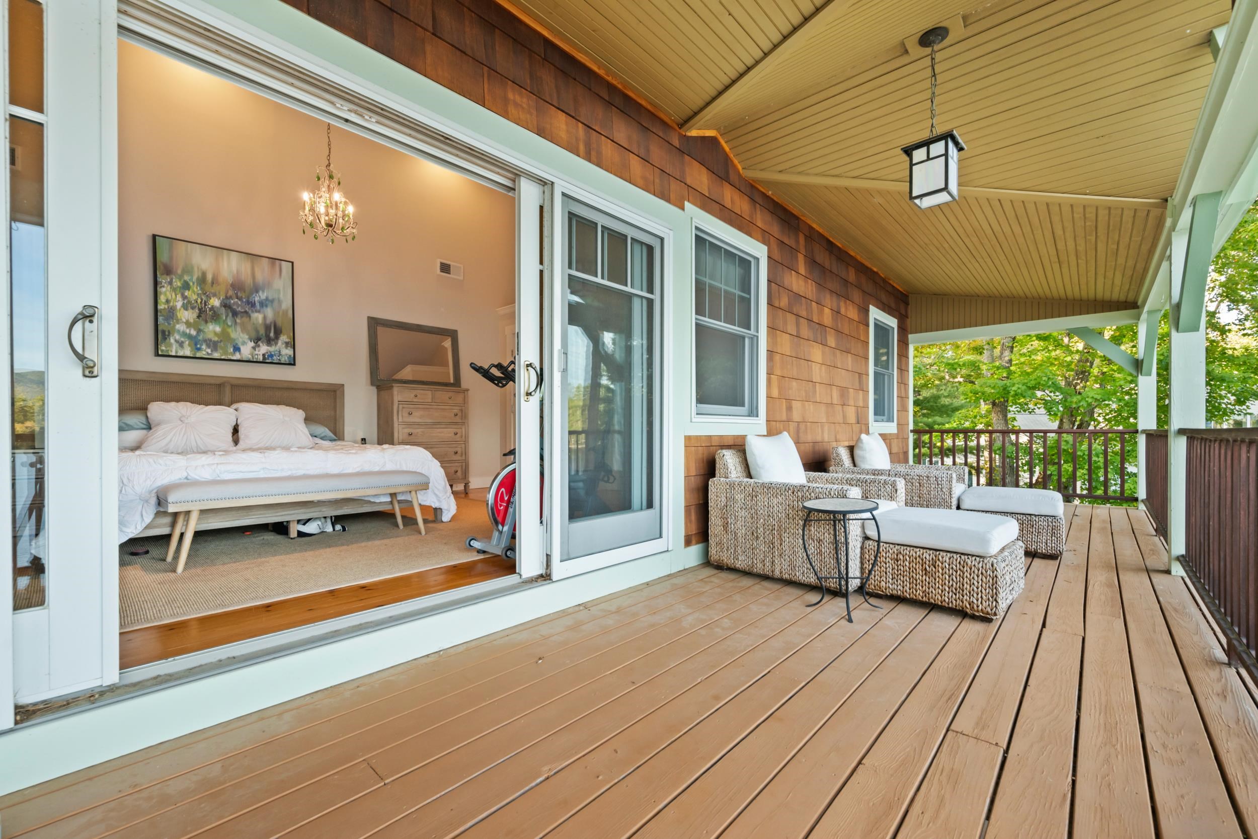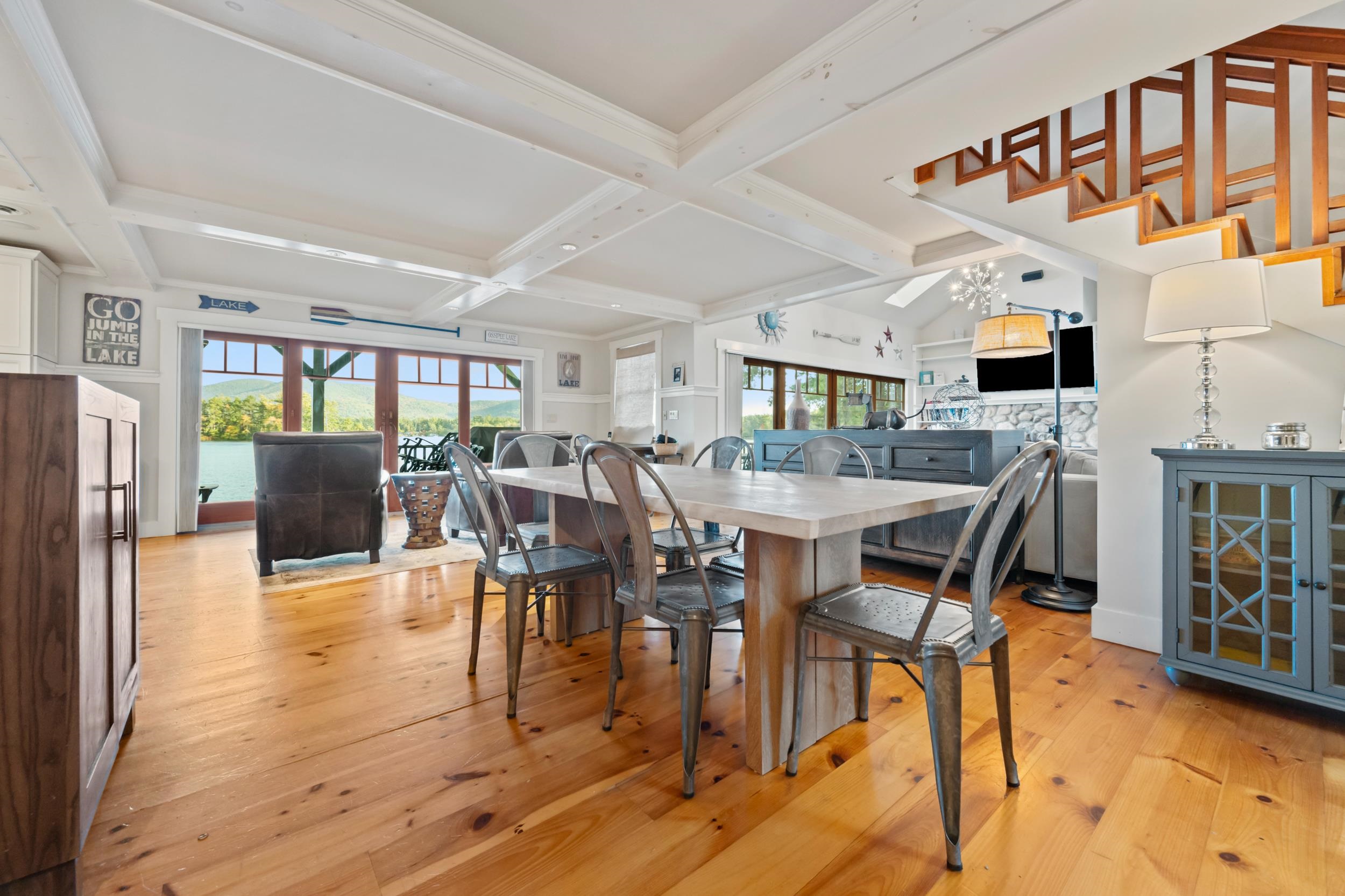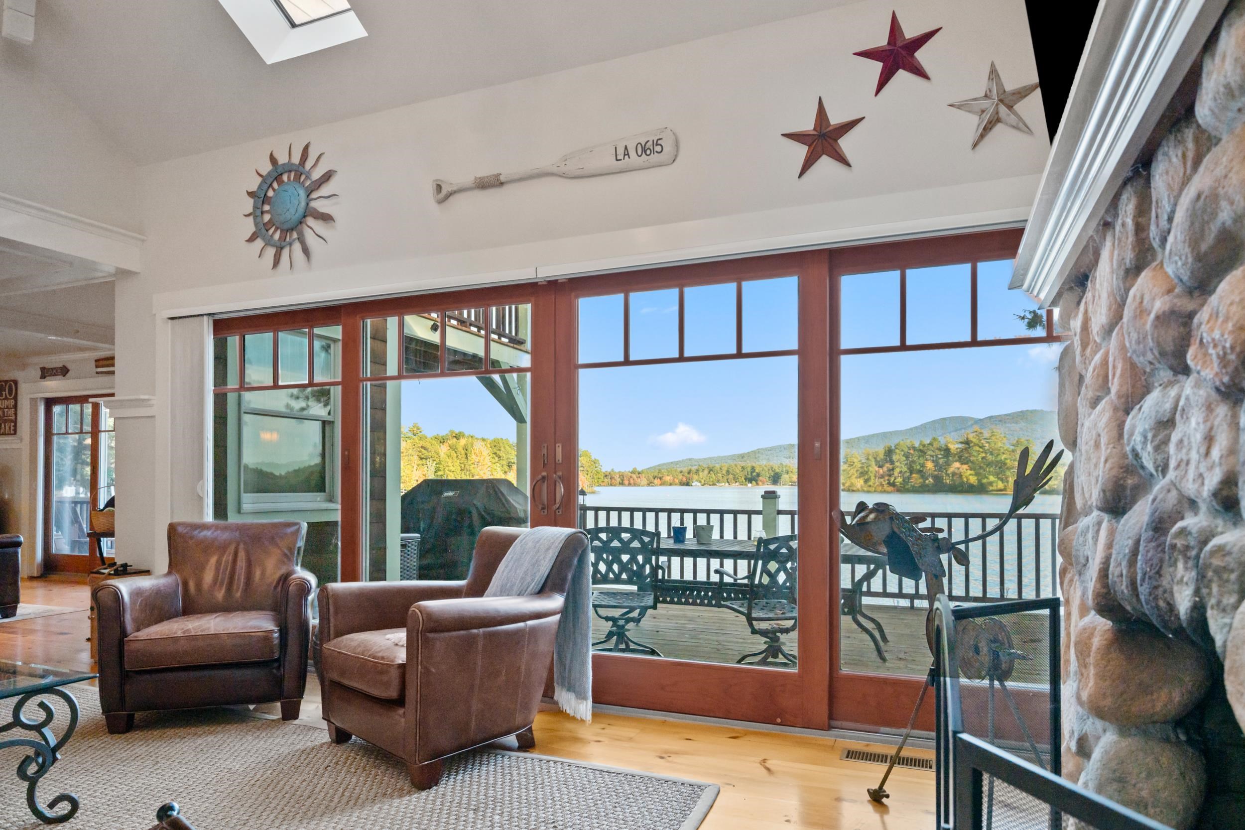 Stunning Ossipee Lake waterfront home on Leavitt Bay! This one of a kind 3 bedroom, 2 1/2 bath home blends timeless Craftsman details with modern comfort. As you step inside, beautiful views of the Lake, Green Mountain, and Loon Island create a striking backdrop to the heart of the home. The chef's kitchen, perfect for entertaining, includes Viking appliances, a wine refrigerator, marble countertops and a generous center island. Wide pine floors throughout the home add warmth and character. The inviting living room offers a cozy stone fireplace and walkout access to a spacious deck just steps to the waterfront. Upstairs you will find two bedrooms and a full bathroom, along with the primary suite featuring a gas fireplace, spa-like bath with a claw foot soaking tub and separate shower, plus a private balcony - the perfect place to enjoy your morning coffee while taking in the sunrise. Outdoors, a beautifully landscaped yard with outdoor shower/changing area, fire pit, irrigation system, and a detached 2 car garage. With 100 feet of sandy beach and your own private dock, this property captures the absolute best of lakefront living.