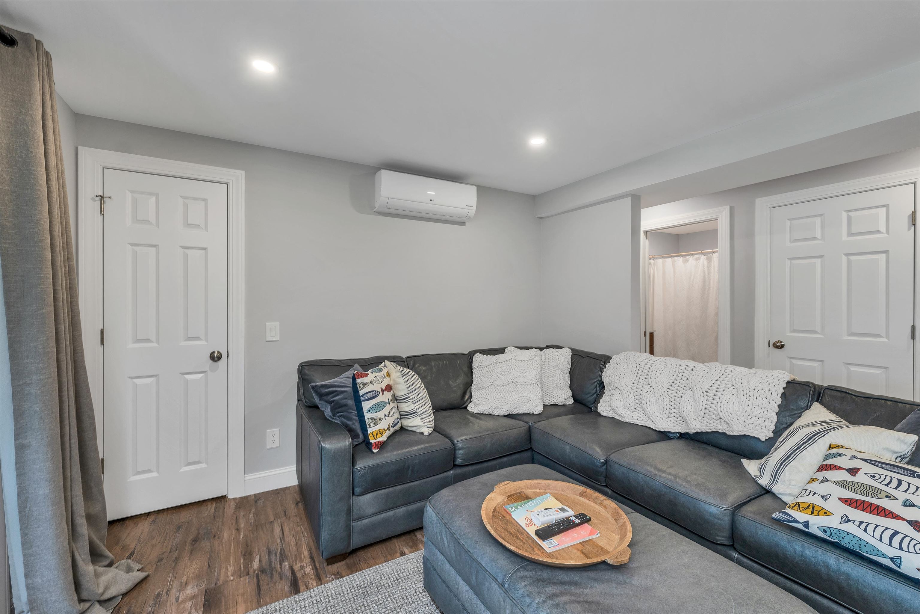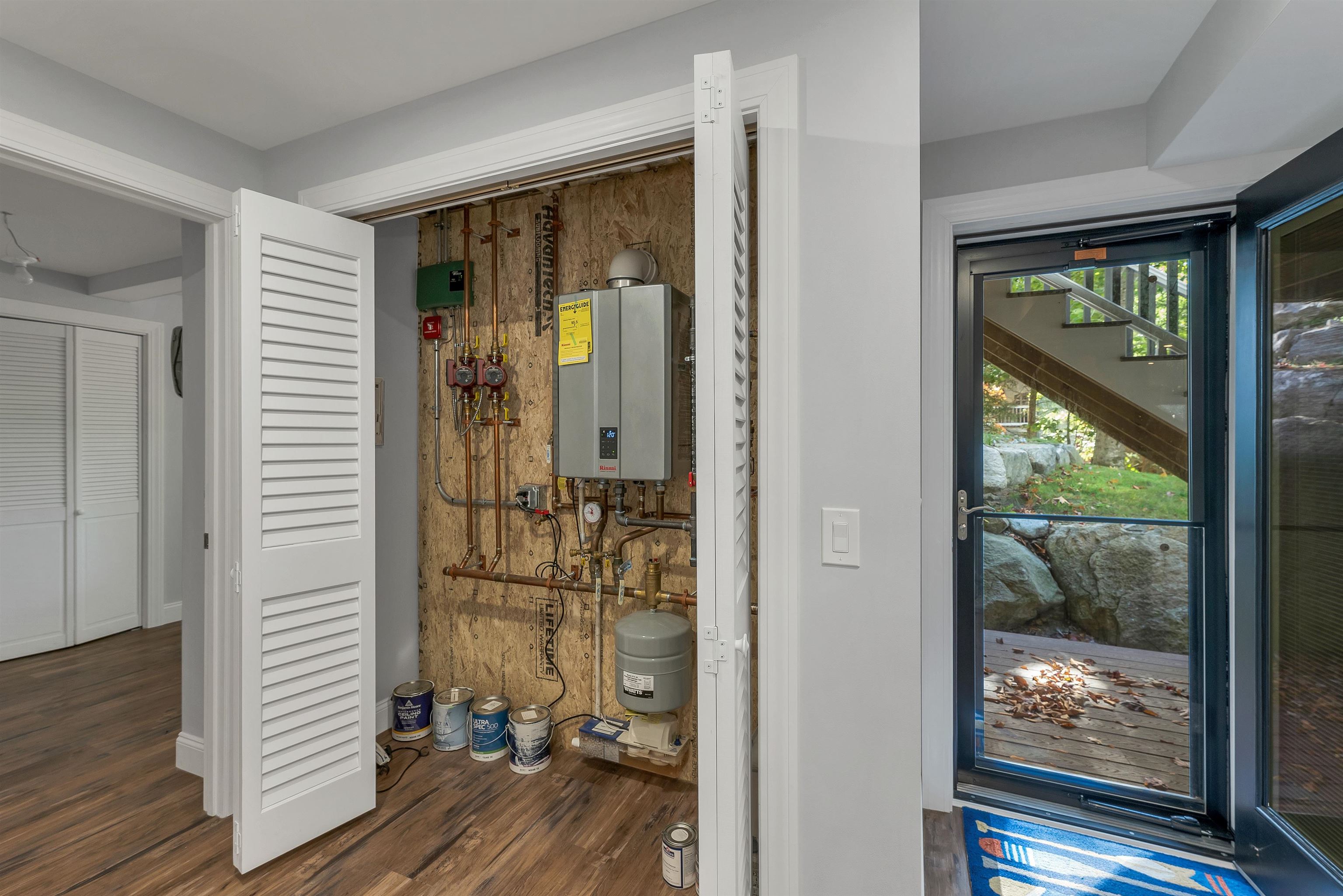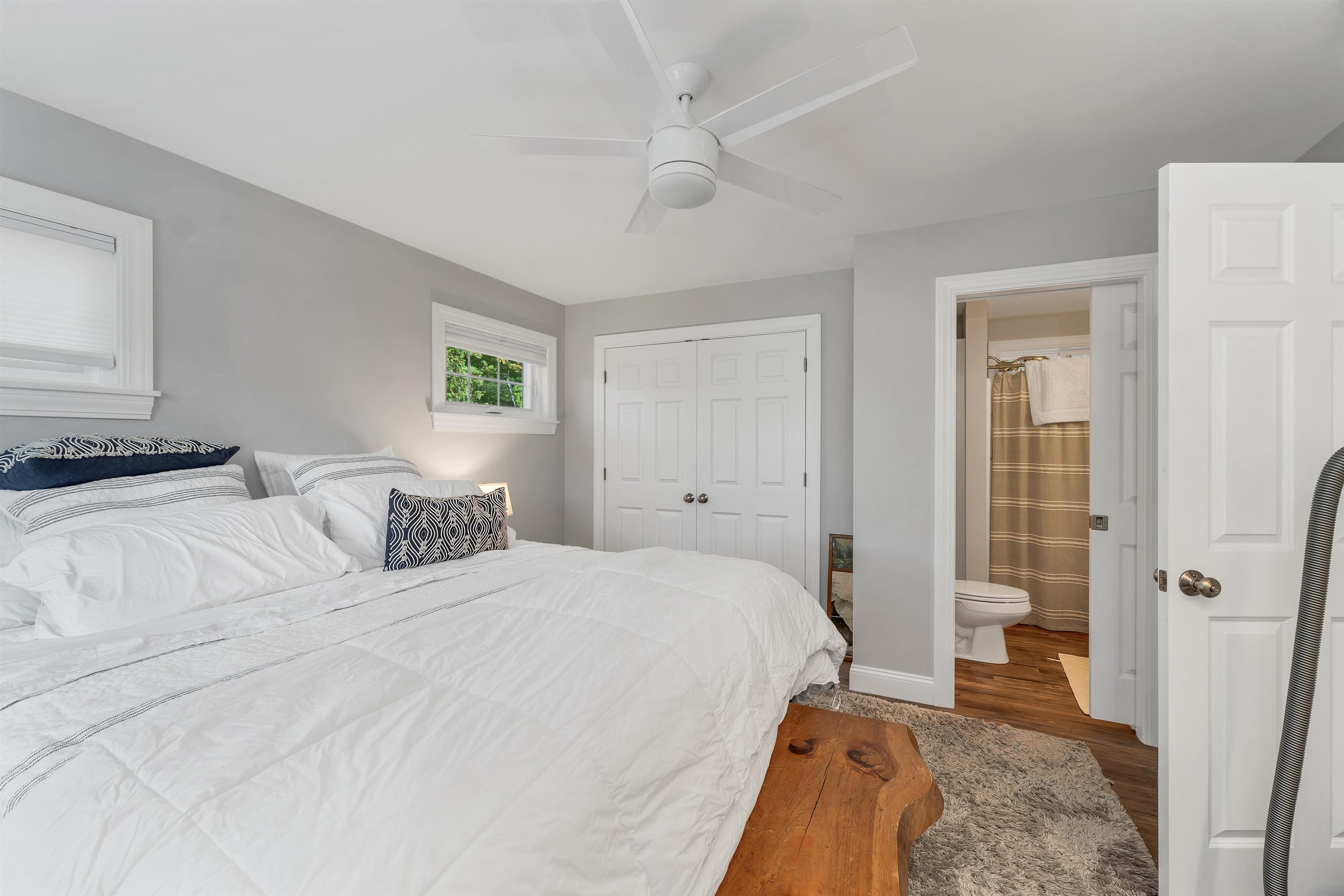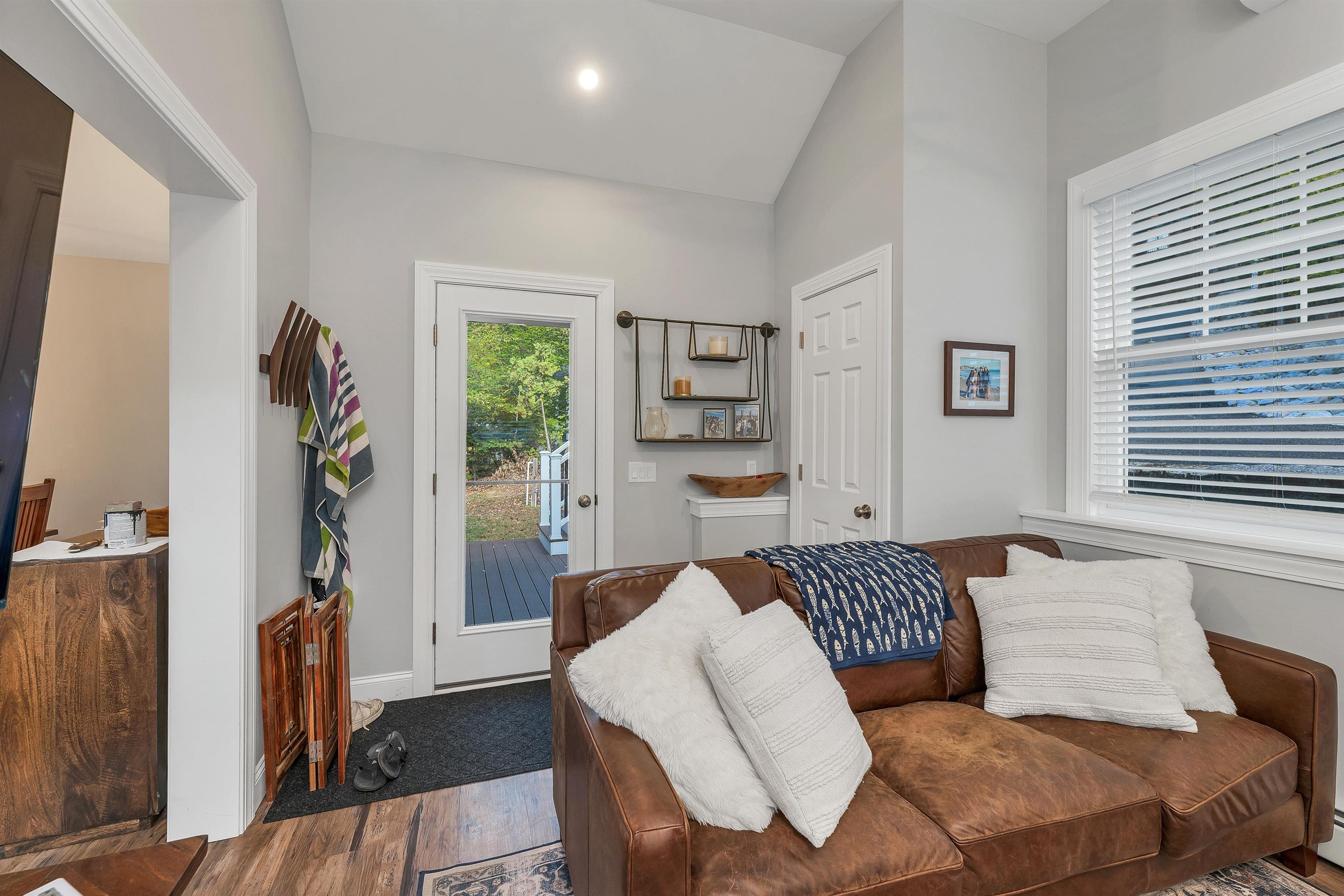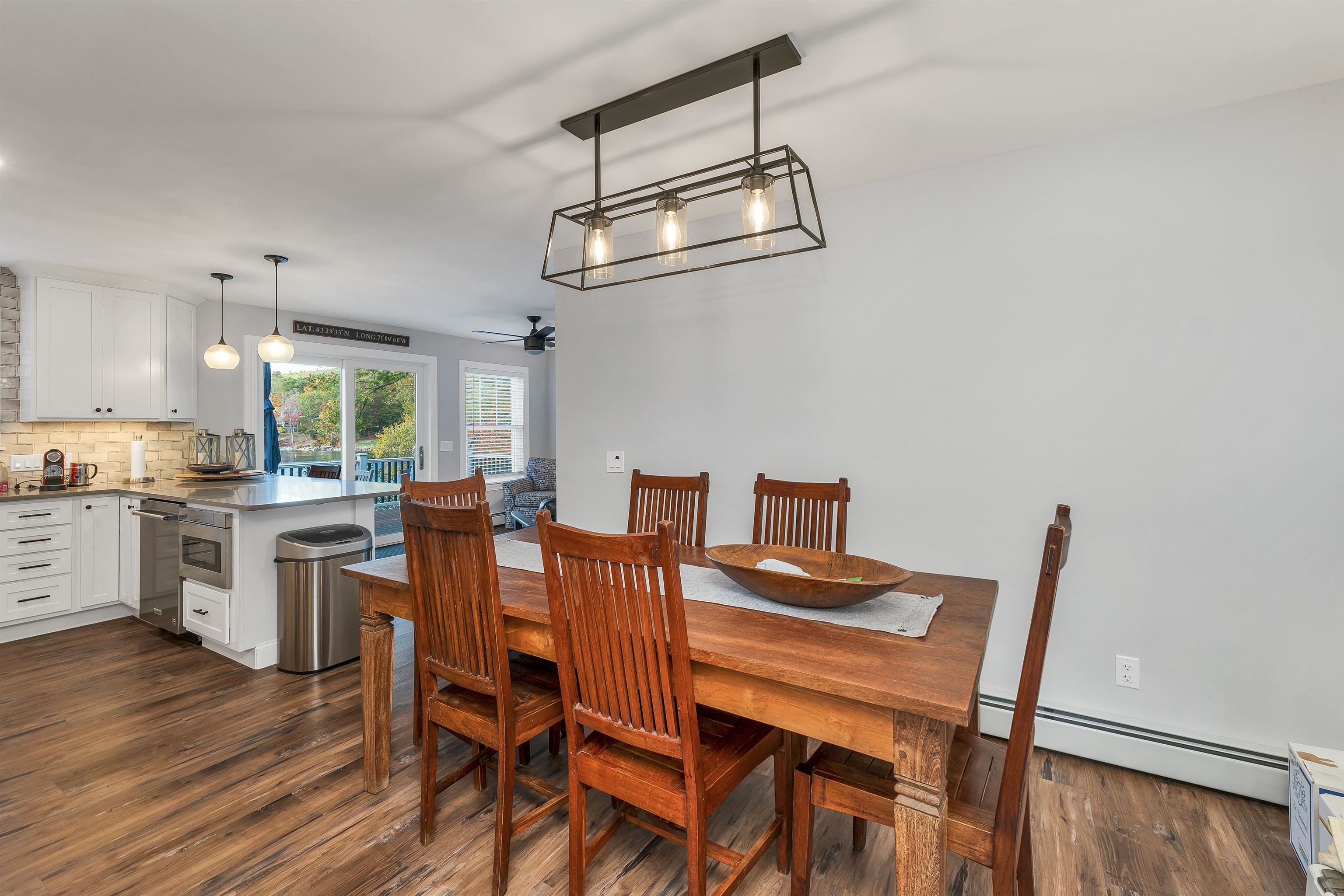 Year-round Contemporary with 118' of waterfront in Elly Cove on Merrymeeting Lake. This well-designed home with a detached 2-car garage has a brand new & move-in ready quality. Enter the home from the 112 sq ft back deck, which brings you into the cozy living room. Step into the dining area, which is adjacent to the beautifully equipped custom kitchen, with an eat-in counter. The family room in the center of the main floor has a sliding door that opens onto the 552 sq ft wrap-around deck overlooking an ever-changing water view. You will enjoy many outdoor meals on this deck. There is a 3/4 bath just off the family room. Another door opens into the main floor primary bedroom suite with a full bath. The closets throughout this home have built-in shelves & drawers, giving you maximum storage capacity. The lower walkout level features two additional bedrooms, a family room & a third full bath. There is a sliding door opening onto another 552 sq ft sheltered wrap-around deck. This level contains a laundry, storage cabinets & well-planned utility areas, plus a back bonus room with another slider to the deck. Step off the deck onto a wide front lawn leading to the sandy beach shoreline, a 40' lift-up dock and a storage shed. The total rebuild on this lot features a brand new 2-bedroom septic system. The detached garage features a finished game room above. Permeable asphalt driveway absorbs any runoff. This low-maintenance home awaits your inspection. The furnishings are negotiable!