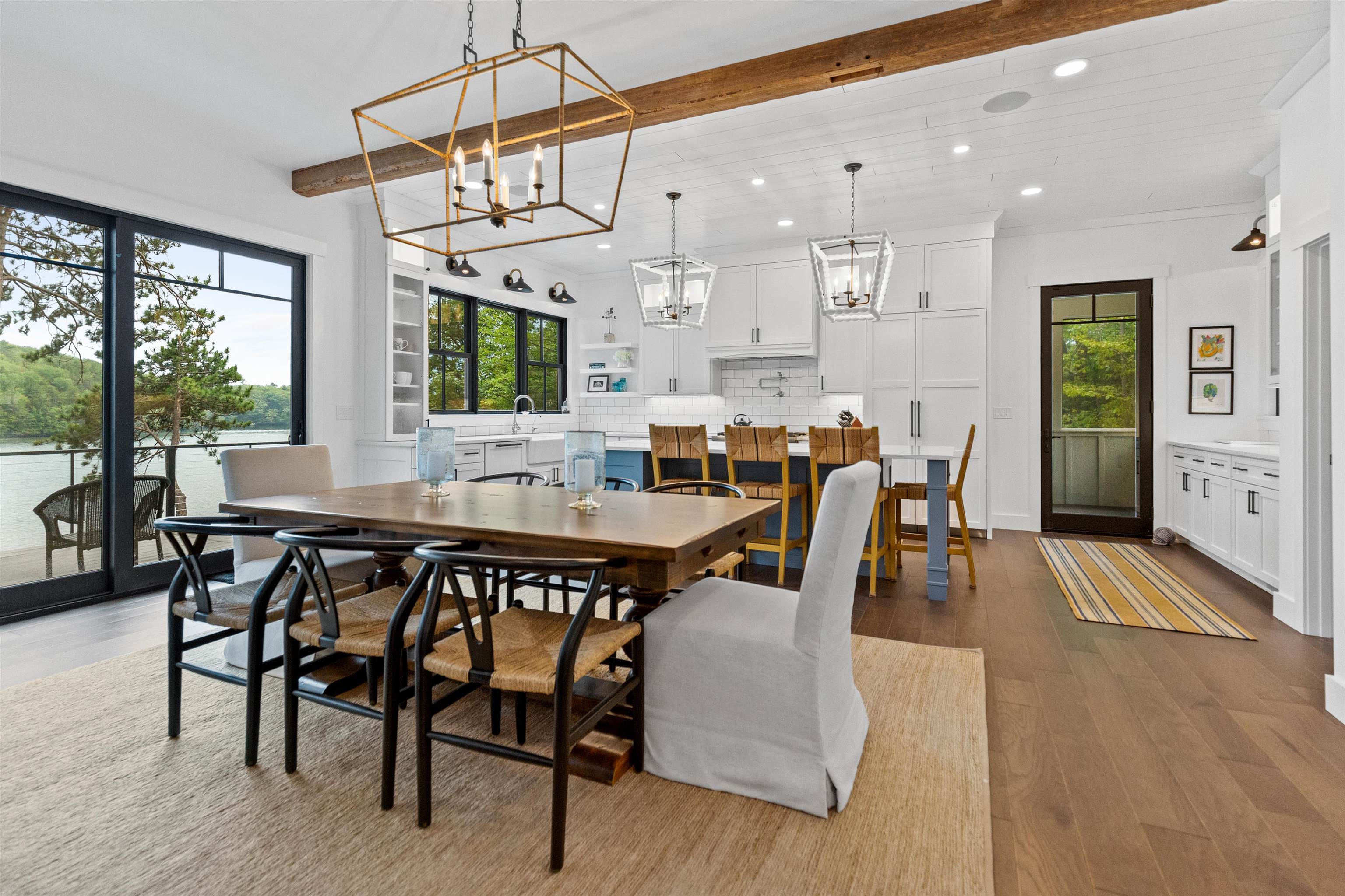 Set on nearly an acre with 201 feet of pristine Lake Winnipesaukee waterfront, this exceptional 3 year young custom residence offers a rare blend of privacy, craftsmanship, and effortless lake living. Perfectly positioned just 10 minutes by car or boat to Meredith's shops and dining, the setting feels secluded yet remarkably convenient. Soak in breathtaking sunsets and serene views toward protected Stonedam Island-ensuring lasting natural beauty. Every detail was meticulously designed. The home offers nearly 5,000 finished square feet of refined living space with 5 bedrooms plus a bunk/bonus room, finished lower level and 7 baths. Gleaming wood floors flow through an open-concept layout anchored by a stunning kitchen featuring quartz countertops, a butler's pantry, and seamless connection to the living room with a gas fireplace framed by dramatic stonework. Enjoy an expansive screened porch with a wood-burning, floor-to-ceiling stone fireplace, ideal for 3 season entertaining. The exterior is equally impressive with exquisite landscaping, lush lawn, mature plantings, irrigation, lighting, patios, fire pit and deck overlooking the water. Enjoy crystal-clear water, a sandy bottom, and a U-shaped docking system accommodating three boats plus jet skis and water toys. A whole-house generator provides peace of mind. Offered fully furnished with minimal exclusions, this is a true turnkey opportunity.
